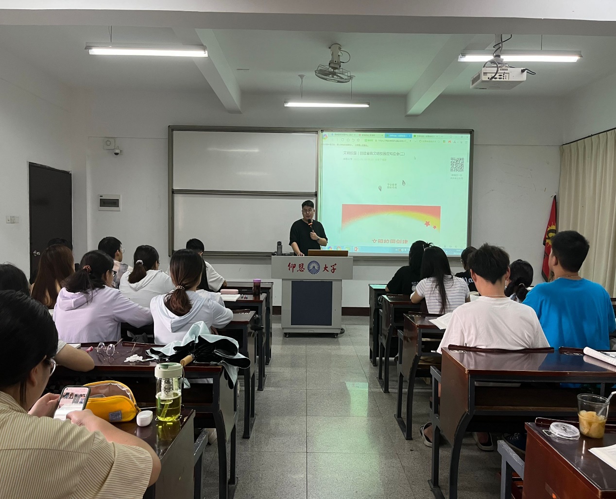此次“创建省级文明校园应知应会”主题班会由各班级班主任领学,全面学习掌握文明校园创建应知应会知识,同时通过各种趣味问答形式加深师生对文明校园创建知识的认识了解,从多个角度加深对文明校园建设的认识,同时强调全体师生在文明校园创建中,务必积极合作配合。一个文明的校园,就必须要有一个文明的班风、学风。这需要全体师生积极行动起来,展现当代老员工的担当,做到文明校园,从自身做起,深化高等学校员工行为准则,树立志愿服务意识,培养担当民族复兴大任的时代新人。
